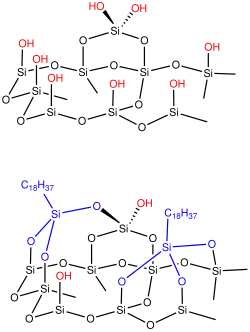 En général, la phase stationnaire est majoritairement composée de petites particules de silice sur lesquelles on a greffé des fonctions chimiques, le plus souvent de chaines alkyles à 8 ou 18 atomes de carbone.