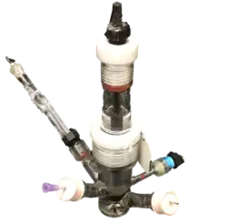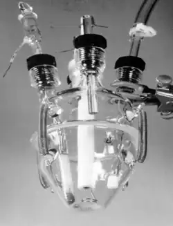 La cellule d'électrolyse (en masse) à potentiel contrôlé est généralement une cellule à deux compartiments (divisée), contenant une anode auxiliaire en tige de carbone et est séparée du compartiment de la cathode par une bougie d'électrolyte à solvant de verre fritté et de méthylcellulose[7]. La raison de la cellule à deux compartiments est de séparer la réaction cathodique et anodique. L'électrode de travail pour l'électrolyse en masse pourrait être un disque RVC, qui a une plus grande surface pour augmenter la vitesse de la réaction[8].
