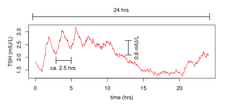 Rythme circadien (période de 24h) et rythme ultradien (période de 2,5h) de la sécretion de l'hormone TSHles rythmes ultradiens, c’est-à-dire d’une fréquence plus rapide qu’un rythme circadien, donc d’une durée théoriquement inférieure à 24 heures;