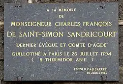 - 1794 (26 juillet) : Charles François-Siméon Vermandois de Saint-Simon, dernier évêque d'Agde, est guillotiné à Paris.