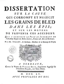 - 1755 : Mathieu Tillet, agronome et botaniste français, est récompensé par l'Académie de Bordeaux pour ses travaux sur les maladies des céréales, dont la carie du blé[11].