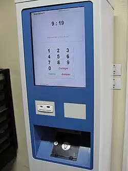 Le chronotachygraphe électronique est un boîtier, de la taille d'un autoradio, comprenant deux lecteurs de cartes, un sélecteur d'entrée manuelle, un écran d'affichage et une imprimante.