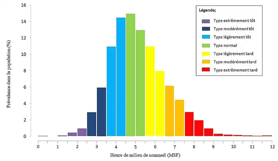 Traditionnellement, on distingue deux principaux chronotypes, soit les « oiseaux de nuit » ou type du soir (type vespéral) et les « oiseaux du matin » ou type du matin (type matinal). Toutefois, il existe un type normal ou intermédiaire et d’autres sous-divisions de chronotypes. De plus, un chronotype n’est pas une catégorie fixe, mais représente plutôt une gamme de caractéristiques. Par exemple, les chronotypes du matin ont une période circadienne plus courte et les chronotypes du soir ont une période circadienne plus longue en général[4]. Les individus du chronotype du soir éprouvent alors une avance de phase lorsqu’ils se réveillent plus tôt[5].