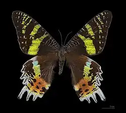 Le dessus des ailes antérieures est vert iridescent avec une aire basale et des zébrures noires, tandis que ses ailes postérieures ont une aire basale noire, une aire médiane blanche, dorée et rouge, ainsi que six queues.