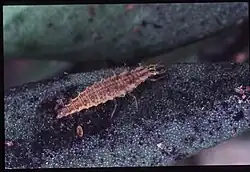 Les larves (7 à 8 mm) sont jaune-grisâtre/vert-brun avec deux bandes longitudinales rouges. Elles sont munies de pièces buccales piqueuses-suceuses pour capturer leurs proies et en aspirer le contenu. Sur les côtés, elles sont pourvues de verrues et de poils.