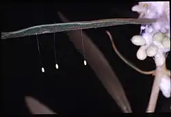 Sur l'image des œufs de chrysope, on peut remarquer une colonie de psylles de l'olivier (Euphyllura olivina) sur la gauche, qui constitue une bonne réserve de nourriture pour les futures larves de chrysope.