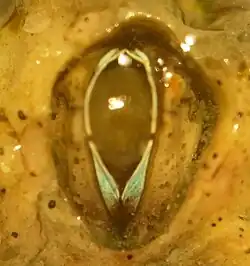 - l’orifice est de forme grossièrement losangique mais les deux bords antérieurs sont plus longs que les postérieurs (forme « en cerf-volant ») chez C. montagui , il est par contre arrondi chez C. stellatus(avec cependant un épaulement chez ls jeunes).
