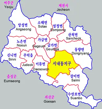 La ville proprement dite est répartie en 12 quartiers (dong) comptant 162 777 habitants pour 97,6 km2, soit une densité de 1668 hab/km2. Les zones rurales l'entourant sont également incluses dans sa juridiction, ce sont la petite ville (eup) de Judeok-eup (주덕읍, 6276 hab., 48,4 km2, 130 hab/km2) et les 12 communes (myeon) suivantes : Daesowon-myeon (살미면, 5303 hab., 61,9 km2, 86 hab/km2, appelé Ilyu-myeon avant le ), Angseong-myeon (앙성면, 4612 hab., 100,3 km2, 46 hab/km2), Geumga-myeon (금가면, 4376 hab., 33,8 km2, 129 hab/km2), Dongnyang-myeon (동량면, 4260 hab., 109,4 km2, 39 hab/km2), Sinni-myeon (신니면, 3767 hab., 59,8 km2, 63 hab/km2), Eomjeong-myeon (엄정면, 3656 hab., 56,5 km2, 65 hab/km2), Suanbo-myeon (수안보면, 3511 hab., 73,4 km2, 48 hab/km2), Gageum-myeon (가금면, 2952 hab., 48,1 km2, 61 hab/km2), Sancheok-myeon (산척면, 2797 hab., 78,4 km2, 36 hab/km2), Noeun-myeon (노은면, 2618 hab., 61,8 km2, 42 hab/km2), Salmi-myeon (살미면, 2195 hab., 91,6 km2, 24 hab/km2), Sotae-myeon (소태면, 2115 hab., 63 km2, 34 hab/km2). Ces chiffres datent du .