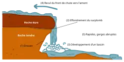 Elle se situe le plus souvent en montagne, où l'un des tronçons d'un torrent voire d'une rivière, voit son lit de trajectoire « coupé » face à une falaise ou une paroi rocheuse abrupte, se transformant sur cette portion en une importante chute d'eau totalement verticale ou très pentue. La chute de l'eau obéit aux lois de la gravité en descendant à vitesse croissante, s'accompagnant d'un certain éparpillement et évaporation des gouttelettes, ainsi qu'un élargissement de dispersion du flux (formant parfois sous le soleil un arc-en-ciel), notamment lors de la percussion en contrebas, retrouvant ensuite son cours régulier de torrent.