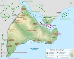 qu'elle a subis. La cité impériale se situe sur une forme de triangle dont deux côtés sont bordés par la mer. Au sud, c'est la mer de Marmara qui mouille les murs de Constantinople et au nord, c'est la Corne d'Or, un port naturel idéal qui s'étend profondément dans les terres et sépare la ville de la colonie génoise de Péra, indépendante de l'Empire byzantin depuis la fin du XIIIe siècle. Du côté terrestre, c'est le mur théodosien qui assure la protection de la cité sur une longueur de 6,5 km. Les dégâts subis lors du siège de 1422 sont en grande partie réparés en 1453. En fait d'un seul rempart, la muraille de Théodose est constituée de deux murs successifs, le mur intérieur et le mur extérieur, séparés par le Péribolos, espace large de douze à dix-huit mètres[66]. Le mur extérieur, d'une hauteur moins importante[Note 6], est précédé d'un fossé dont certaines portions sont inondables. Il est d'une largeur moyenne de 18 mètres et d'une profondeur de six à neuf mètres[67]. Juste après le fossé se trouve un espace nommé Parateichion, entre l'ouvrage de soutènement surplombant le fossé et le rempart extérieur. Cet espace est large d'une quinzaine de mètres. À la pointe nord du mur de Théodose se trouve le quartier des Blachernes. Cet ancien faubourg, incorporé à la cité au VIIe siècle, est entouré d'une muraille simple, renforcée sous Manuel Ier[68]. Les murailles maritimes sont de simples remparts construits le long du rivage, percés de quelques portes qui donnent directement sur la mer[Note 7]. Du fait de leur disposition et des courants de la mer de Marmara, ces remparts sont peu susceptibles de subir des attaques, d'autant plus que la Corne d'Or peut être barrée par une longue chaîne tendue entre Constantinople et Péra. Dans le courant du siège, Constantin et ses conseillers décident de se reposer principalement sur le mur extérieur pour la défense de la ville, y positionnant l'essentiel de leurs effectifs, ce qui a pu être critiqué étant donné que le rempart y est moins imposant et que les Turcs ont une puissante artillerie[69].