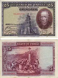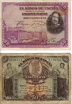 L'un des points clés de la propagande de la dictature fut qu'elle avait réussi à rétablir la valeur de la peseta — la « dépréciation de la monnaie » avait été l'une des raisons invoquées pour justifier le coup d'État. Lorsque Primo de Rivera arriva au pouvoir, le taux de change du dollar américain était de 7,50 pesetas ; dans les années suivantes, la monnaie espagnole se réévalua par rapport au dollar et à la livre sterling. En 1927, le taux de change du dollar était de 5,18 pesetas et celui de la livre sterling était légèrement inférieur à 28 pesetas[86]. Néanmoins, la réévaluation de la peseta était en grande partie artificielle, puisqu'elle était fondamentalement due à des mouvements spéculatifs de capitaux étrangers attirés par des taux d'intérêt élevés et les perspectives haussières de la monnaie — qui répondaient à la réduction du déficit de la balance commerciale et, surtout, à la consolidation du régime dictatorial, avec la victoire dans la guerre du Rif et le passage du Directoire militaire au Directoire civil en décembre 1925[87] —.