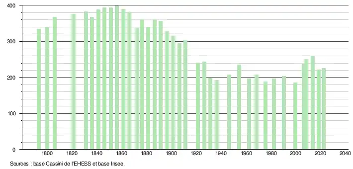 L'évolution du nombre d'habitants est connue à travers les recensements de la population effectués dans la commune depuis 1793. Pour les communes de moins de 10 000 habitants, une enquête de recensement portant sur toute la population est réalisée tous les cinq ans, les populations de référence des années intermédiaires étant quant à elles estimées par interpolation ou extrapolation[27]. Pour la commune, le premier recensement exhaustif entrant dans le cadre du nouveau dispositif a été réalisé en 2008[28].