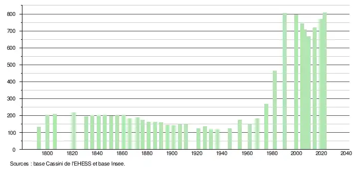 L'évolution du nombre d'habitants est connue à travers les recensements de la population effectués dans la commune depuis 1793. Pour les communes de moins de 10 000 habitants, une enquête de recensement portant sur toute la population est réalisée tous les cinq ans, les populations de référence des années intermédiaires étant quant à elles estimées par interpolation ou extrapolation[27]. Pour la commune, le premier recensement exhaustif entrant dans le cadre du nouveau dispositif a été réalisé en 2004[28].