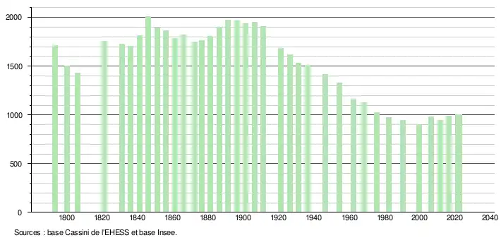 L'évolution du nombre d'habitants est connue à travers les recensements de la population effectués dans la commune depuis 1793. Pour les communes de moins de 10 000 habitants, une enquête de recensement portant sur toute la population est réalisée tous les cinq ans, les populations de référence des années intermédiaires étant quant à elles estimées par interpolation ou extrapolation[19]. Pour la commune, le premier recensement exhaustif entrant dans le cadre du nouveau dispositif a été réalisé en 2006[20].