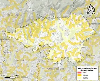 Le retrait-gonflement des sols argileux est susceptible d'engendrer des dommages importants aux bâtiments en cas d’alternance de périodes de sécheresse et de pluie[16]. 38,7 % de la superficie communale est en aléa moyen ou fort (27 % au niveau départemental et 48,5 % au niveau national métropolitain)[Carte 2]. Depuis le , en application de la loi ÉLAN, différentes contraintes s'imposent aux vendeurs, maîtres d'ouvrages ou constructeurs de biens situés dans une zone classée en aléa moyen ou fort[Note 3],[17].