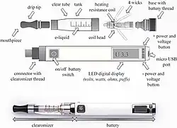 Le principe d'une cigarette électronique consiste à produire un aérosol imitant la fumée de tabac. La technique la plus courante consiste à chauffer le liquide (dit liquide à vapoter[11] ou e-liquide) par l'intermédiaire d'une résistance chauffante faisant partie de l’atomiseur (dispositif pouvant être appelé « clearomiseur », « tank », « RTA », « RDTA », etc. en fonction de son principe de fonctionnement).