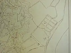 En 1826 on construit une nouvelle chapelle, baptisée également Saint-Roch[17]. Le cimetière suit l'évolution démographique de la ville et s'agrandit à cinq reprises au cours du XIXe siècle et trois fois durant le XXe siècle. Le premier agrandissement du cimetière a lieu en 1843, quelques années après la construction d'une nouvelle extension de l'enceinte de la ville par le général Haxo et la mise en service d'une nouvelle porte des fortifications desservant le cimetière qui prend le nom évocateur de porte des Adieux, démoile en 1924[18],[N 8]. En 1854, le cimetière s’agrandit une seconde fois avec une nouvelle enceinte en forme d’hémicycle au nord du terrain historique, puis, au gré des nécessités, des agrandissements sont programmés en 1866[19], 1884, 1899, 1907, 1921 et 1926 totalisant ainsi 15 kilomètres d'allées piétonnes d'une planéité parfaite[N 9]. Son altitude annoncée dans un plan établi par le géomètre J. Boiton daté de 1815 est de 212,0 mètres[20].