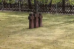 L'hétérogénéité[6] des personnes inhumées à Halbe est de loin sa première caractéristique. La clôture croisée en bois qui entoure tout le cimetière militaire d'Halbe est sans nul doute très rare aussi. Cela peut poser un problème en soi quand on sait que les groupes de 3 croix en pierre (ou même 5 au cimetière de La Cambe en Normandie) disposés de manière aléatoire sur tout le terrain gazonné représentent dans l'esprit du paysagiste Tischler pour le compte du VDK depuis les années 1930 l'idée de communauté de lutte et de destin[7]. C'est comme si trois personnes se donnaient la main. Le symbole de la croix souligne les origines chrétiennes de la plupart des soldats allemands et l'aspect massif de la croix en grès ou en granit renvoie clairement à la force et à la stabilité des combattants. Or, à Halbe, tout le monde n'est pas soldat. La symbolique de la fraternité indissoluble dans le combat contraste avec la perte de la dignité engendrée par le statut de prisonniers faisant un travail forcé ou avec le reproche considéré comme infamant après 1945 d'avoir été un ex-membre actif d'organisations nazies qui doit purger sa peine dans un camp de prisonniers soviétique.