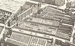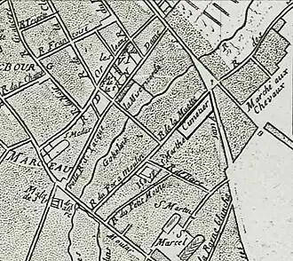 Les no 1 à 17 de l'actuelle rue du Fer-à-Moulin, alors dénommée rue de la Muette, la rue Scipion alors dénommée rue de la Barre, la rue des Francs-Bourgeois-Saint-Marcel qui a été supprimée lors du percement du boulevard Saint-Marcel et la rue des Fossés-Saint-Marcel ou s'effectuait l'entrée du cimetière[4].