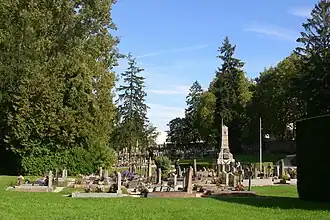 - Les dépouilles de 2 179 officiers, sous-officiers et soldats, tués lors de la guerre franco-allemande de 1870 [37] réparties dans 2 fosses communes de part et d'autre de l'allée centrale[25] et honorées par un monument inauguré en 1886 par le général Wolff commandant du 7e corps d'armée. Tombées aux combats de Villersexel et Héricourt, on compte parmi les victimes environ 500 Comtois, cinquante à soixante non-identifiés, vingt-cinq appelés du 1er bataillon du Tarn-et-Garonne[Note 1], ainsi que quinze ennemis[25]. La liste des victimes est gravée sur 12 feuilles de bronze (livre d'airain)[38] qui avaient été déposées dans un coffre à la base de l'obélisque, le 14 août 1893[1],[39]. En 2014, la municipalité a transféré le livre au musée du Temps[40],[41].