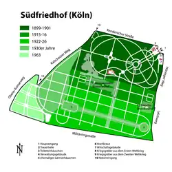 - (de) Cet article est partiellement ou en totalité issu de l’article de Wikipédia en allemand intitulé « Südfriedhof (Köln) » (voir la liste des auteurs).