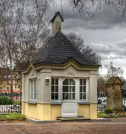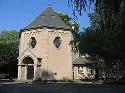 L'on n'avait pas prévu au départ de construire un funérarium, car la plupart des défunts étaient à l'époque d'abord veillés à domicile avant d'être enterrés au cimetière. Mais avec la croissance de la population, et surtout d'une population ouvrière, des raisons d'hygiène imposent l'usage de veiller les morts dans un funérarium avec des pièces aménagées. Cependant à cause du conflit avec le gouvernement prussien il a fallu plusieurs années que le bâtiment puisse être construit. Le funérarium octogonal à droite de l'entrée a finalement été inauguré en 1912.