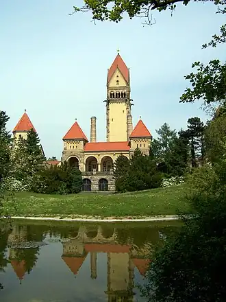 En son centre se dresse un ensemble de bâtiments néoromans dont la chapelle avec son clocher de 63 m de haut, le plus haut clocher dans un cimetière en Allemagne. Cet ensemble symétrique a été construit de 1907 à 1909 selon les plans de l'architecte Otto Wilhelm Scharenberg (1851 - 1920) selon le modèle de l'abbaye de Maria Laach dans la région d'Eifel. Il comprend un crématorium et un colombarium.