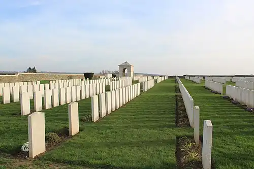 Le cimetière contient 1 838 sépultures du Commonwealth et les commémorations de la Première Guerre mondiale, dont 21 des sépultures sont non identifiées et neuf tombes du Commonwealth fabriquées par les Allemands et qui ne peuvent plus être trouvées sont représentées par des monuments commémoratifs spéciaux. Le cimetière contient également 198 sépultures de guerre allemandes et les tombes de dix civils français. Le cimetière, à l'imposant portail, a été conçu par Sir Reginald Blomfield.