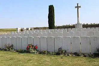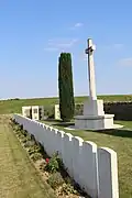 Le cimetière a été construit peu après la capture de la ferme. Il y a maintenant près de 140 victimes de guerre 1914-18 commémorées dans ce cimetière. Parmi ceux-ci, un petit nombre n'est pas identifié. Tous sauf un sont tombés au début d'octobre 1918. On y accède par un petit chemin engazonné au milieu des cultures. Ce cimetière est entouré d'un mur de moellons[1].