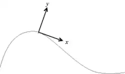Pour simplifier les calculs, on définit souvent un repère local dit « de Frenet » pour chaque instant ; en un point de la courbe, l'axe des x est la tangente à la courbe et orienté dans le sens du mouvement, et l'axe des y est la normale à la courbe orienté de sorte que le repère soit direct[6]. Ce n'est pas un référentiel mobile par rapport au référentiel de l'étude, c'est un repère instantané, défini juste à un instant t pour simplifier l'écriture des grandeurs à cet instant donné. Le référentiel reste celui du laboratoire, seule change la manière dont on exprime les composantes des vecteurs.