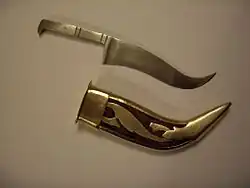 - le Kirpan : poignard prenant généralement la forme d'une dague courbe. En portant une arme, parfois symbolisée de nos jours par une dague en miniature, les sikhs gardent en mémoire les persécutions que leur religion et tant d'autres ont subies, et la nécessité de défendre la liberté de conscience — la leur et celle des autres — contre l'obscurantisme. Cette dague représente la valeur du courage.