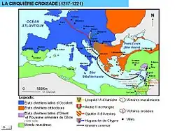 La cinquième croisade (1217–1221) est une campagne militaire dont le but était d’envahir et de conquérir une partie du sultanat ayyoubide d’Égypte afin de pouvoir échanger les territoires conquis contre les anciens territoires du royaume de Jérusalem se trouvant sous contrôle ayyoubide. Malgré la prise de Damiette, cette croisade fut un échec, à cause de l’intransigeance du légat Pélage et de sa méconnaissance de la politique locale, ce qui le conduisit à refuser les négociations au bon moment.