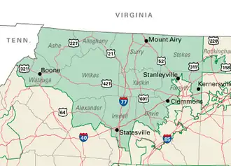 Le 5e district congressionnel de Caroline du Nord couvre la partie centre-ouest de la Caroline du Nord, depuis les Appalaches jusqu'à la banlieue ouest de la Piedmont Triad. Le district borde le Tennessee et la Virginie, avec la majeure partie de son territoire dans les montagnes ; il s'étend juste assez loin à l'est pour s'emparer de sa part du comté de Forsyth, qui abrite la majeure partie de sa population.