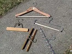 - d'une pièce de bois, découpée en forme de boomerang, au sommet de laquelle est inséré un crochet métallique : sa plus grande épaisseur et ses arêtes arrondies permettent d'éviter les marques.