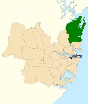 La circonscription de Mackellar (en vert) au nord de Sydney en Nouvelle-Galles du Sud.
