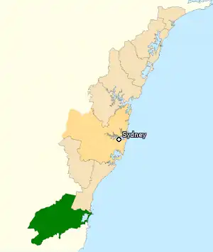 La circonscription de Throsby (en vert) au sud de Sydney (en beige)) en Nouvelle-Galles du Sud.