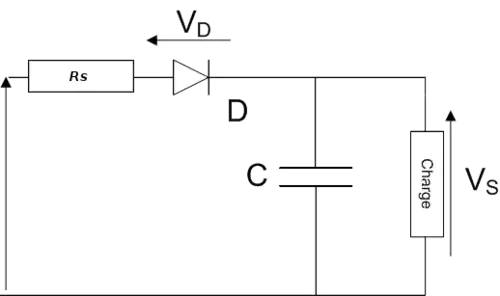 - Dans le cas idéal la tension de la diode serait nulle ainsi que la résistance de sortie et le condensateur se chargerait instantanément[2],[3].
