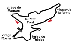 Forte remontée jusqu'à l'épingle la plus serrée du circuit, rapidement enchaînée par un virage gauche en montée, commandant l'importante courbe à près de 180° du tertre de Thèdes. Commencée en montée et se prolongeant en descente, cette courbe à droite d'un rayon non constant nécessite une trajectoire particulière. Une dernière courbe à gauche et le parcours se termine par le très serré virage à droite Louis Rosier.