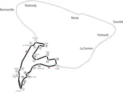 Bien que le nom de la ville de Spa, voisine, y soit associé, aucune partie du circuit ne se situe sur son territoire[4]. Le circuit se trouve aux abords du village de Francorchamps dans la commune de Stavelot avec des incursions sur le territoire de la commune de Malmedy, à l'est de l'Ardenne.