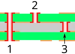Les liaisons entre les pistes des différentes couches et les composants sont assurées par de minuscules rivets conducteurs ou maintenant par des trous métallisés (dépôt de cuivre chimique, puis électrolytique car le bain de cuivre chimique ne permet pas un dépôt suffisamment épais) appelés vias.