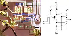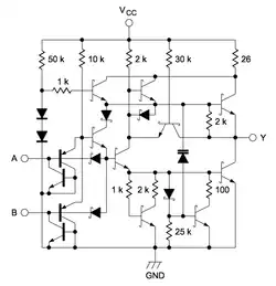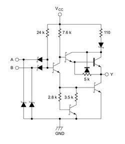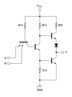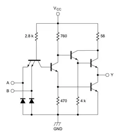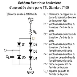 † Remarque : on trouve deux ou trois jonctions P-N en série (dont deux appartenant à l'amplificateur) entre le point [c] et la masse (GND) et une seule jonction P-N entre le point [c] et chaque entrée. Ces jonctions P-N présentant des tensions de seuil relativement faibles, cette configuration limite fortement la tension de basculement de la porte logique et, par conséquent, les tensions qui définissent les états logiques (état bas au-dessous de 0,8 V, état haut au-dessus de 2 V). Par ailleurs, l'application d'un niveau logique haut sur une entrée entraînant le blocage de la jonction P-N qui y est reliée, le courant d'entrée (statique) à l'état haut est quasiment nul (< 50 µA).