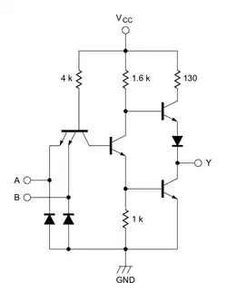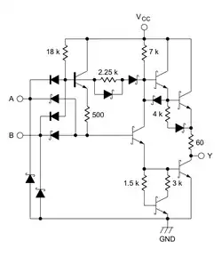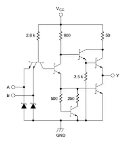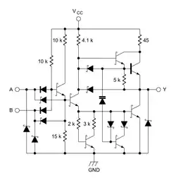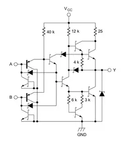 - un amplificateur inverseur de type push-pull ("totem-pole") qui inverse le résultat logique précédent (opérateur NON) et produit sur la sortie (Y) une tension conforme au niveau TTL correspondant.