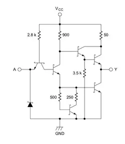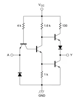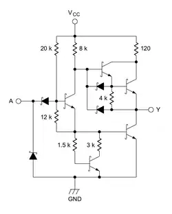 - ↑ (en) Spécifications des circuits S5404/N7404, Signetics Digital 54/7400 Data Book, 1972