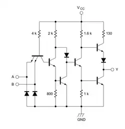 Schéma d'une porte du circuit SN7408 (TTL standard) de Texas Instruments.