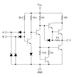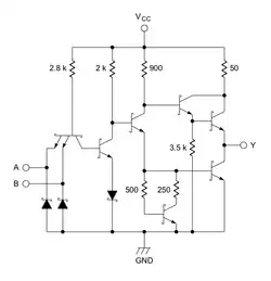 Schéma d'une porte du circuit SN74LS08 (TTL Low-power Schottky) de Texas Instruments.