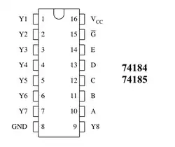 Le 74185 présente 5 entrées de données (A à E), 8 sorties de données à collecteur ouvert (Y1 à Y8) et une entrée d'invalidation des sorties (G).