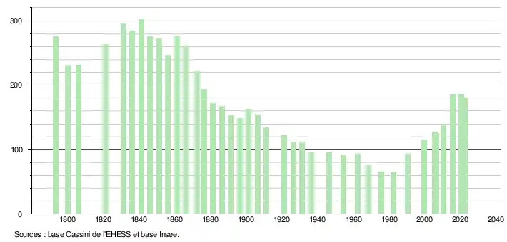 L'évolution du nombre d'habitants est connue à travers les recensements de la population effectués dans la commune depuis 1793. Pour les communes de moins de 10 000 habitants, une enquête de recensement portant sur toute la population est réalisée tous les cinq ans, les populations de référence des années intermédiaires étant quant à elles estimées par interpolation ou extrapolation[16]. Pour la commune, le premier recensement exhaustif entrant dans le cadre du nouveau dispositif a été réalisé en 2005[17].