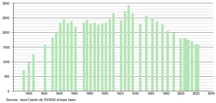 L'évolution du nombre d'habitants est connue à travers les recensements de la population effectués dans la commune depuis 1793. Pour les communes de moins de 10 000 habitants, une enquête de recensement portant sur toute la population est réalisée tous les cinq ans, les populations de référence des années intermédiaires étant quant à elles estimées par interpolation ou extrapolation[56]. Pour la commune, le premier recensement exhaustif entrant dans le cadre du nouveau dispositif a été réalisé en 2004[57].