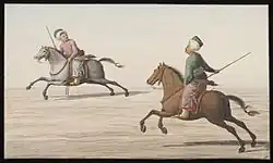« Dans la plupart des cérémonies publiques où assiste le sultan, la marche se porte à l'Atmeydan[4]. On voit aussi dans cette place les Turcs se livrer à une sorte d'exercice militaire appelé djirit. Deux ou plusieurs combattants montés sur des chevaux très vifs sont armés d'une baguette blanche d'environ quatre pieds de long qu'ils se lancent l'un à l'autre avec une grande violence. L'adresse consiste à éviter le coup et à poursuivre l'antagoniste dans sa retraite, à arrêter son cheval au galop, ou à se baisser assez sans quitter la selle pour ramasser le djirit à terre. Embarrassés dans leurs longs vêtements, et semblant devoir être énervés par leur genre de vie, les Turcs étonnent par l'agilité avec laquelle ils exécutent ces évolutions également fatigantes et dangereuses. Les jeunes gens à la mode s'étudient à exceller dans ce jeu auquel on les accoutume de bonne heure parce-qu'il est regardé comme une partie nécessaire de leur éducation. Le sultan actuel avant qu'il eût grossi s'en acquittoit, dit-on, avec beaucoup d'adresse et de grâce et l'emportoit même sur la plupart de ses courtisans. Sultan Soliman, fils d'Orcan, fut tué en se livrant à cet exercice[5]. »