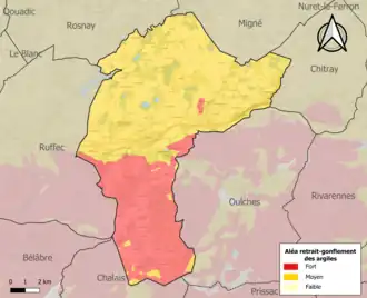 Le retrait-gonflement des sols argileux est susceptible d'engendrer des dommages importants aux bâtiments en cas d’alternance de périodes de sécheresse et de pluie. 99,7 % de la superficie communale est en aléa moyen ou fort (84,7 % au niveau départemental et 48,5 % au niveau national). Sur les 385 bâtiments dénombrés sur la commune en 2019, 385 sont en aléa moyen ou fort, soit 100 %, à comparer aux 86 % au niveau départemental et 54 % au niveau national. Une cartographie de l'exposition du territoire national au retrait gonflement des sols argileux est disponible sur le site du BRGM[22],[23].